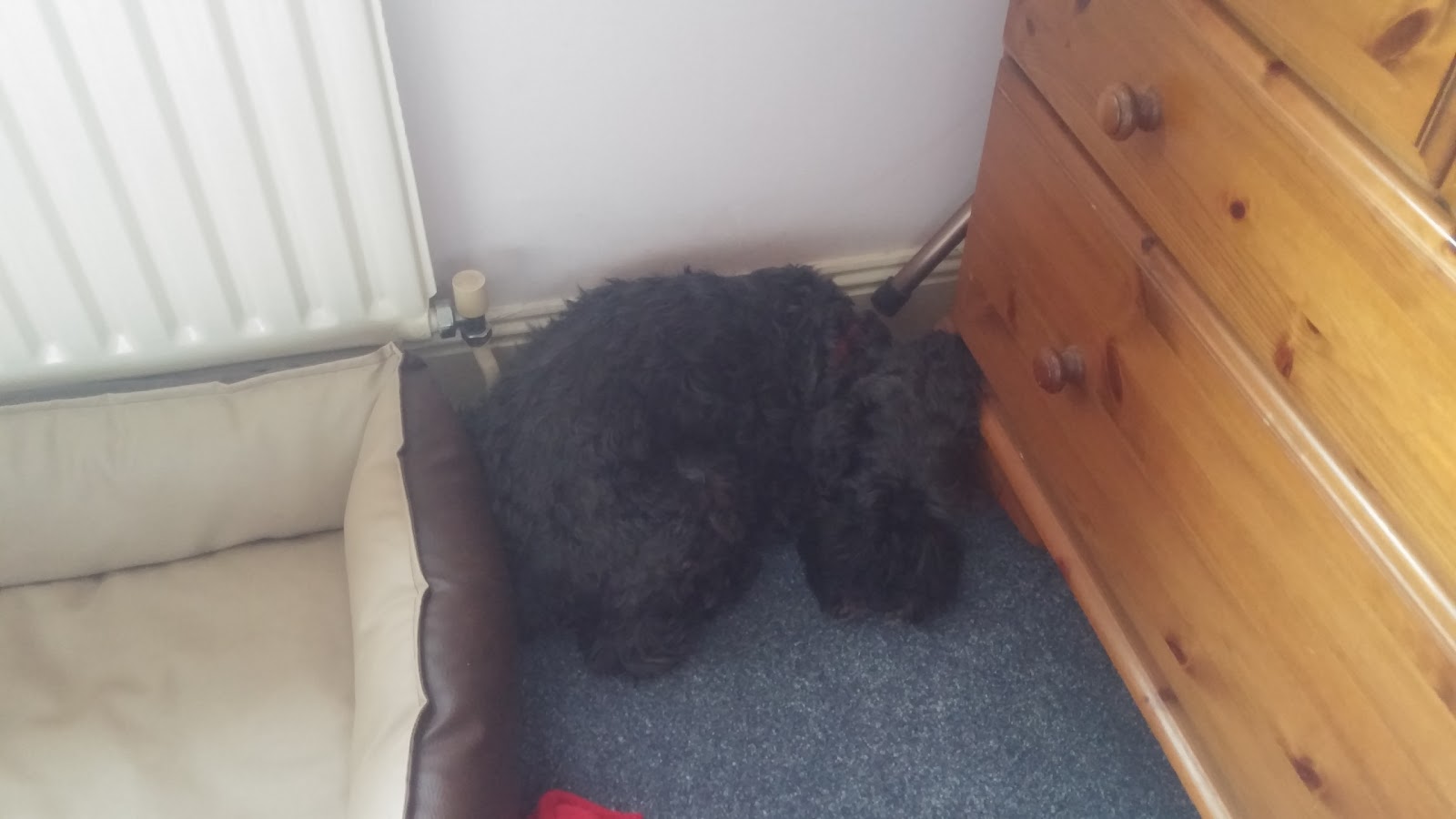 This was Sooty when he heard he was to get a pre Christmas bath. Legs turned to jelly lol and hiding in the corner furthest from me as the door was shut so he couldn't dash down the stairs!