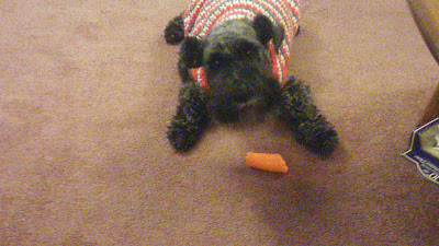 The photo of her sitting is when she first arrived, sitting looking cute in her new crocheted jumper with pretty buttons to put it on - until she chewed them all off making holes in the process! Now it is sewn together and has to go over her head and has a few chunks missing!