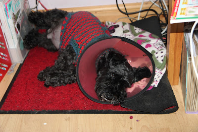 Here's Sooty just after the operation, wearing his pink lampshade and Alfie's jumper because he was shaved quite a lot. He really liked the home cooked chicken and rice, I had to keep it going for a week to get the antibiotics into him, and he looked a bit disappointed when it stopped but it did make his beard very smelly!