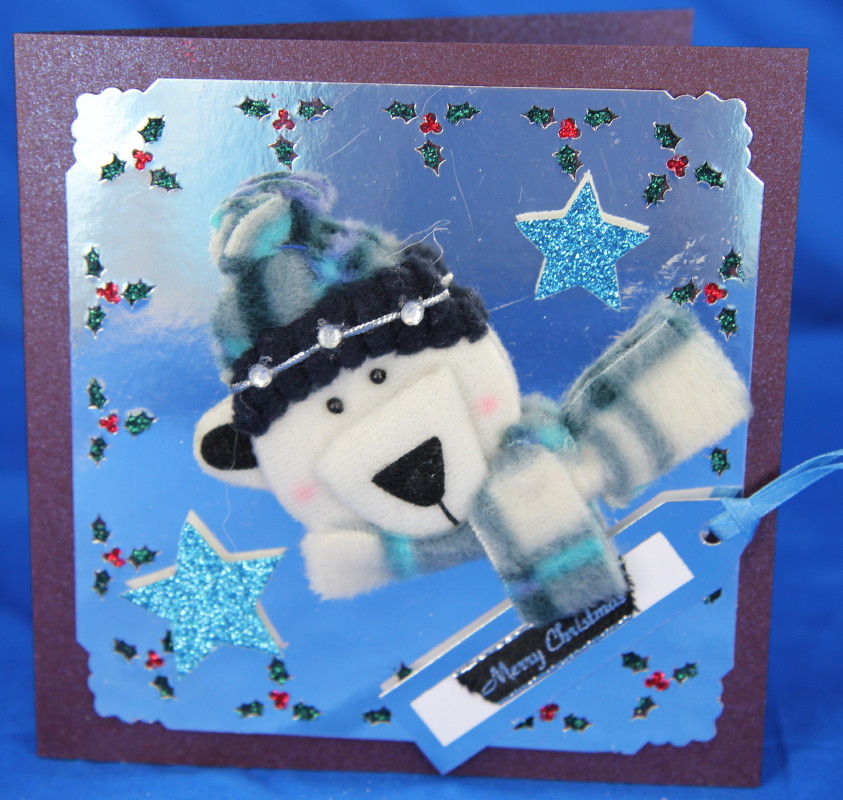 This was inspired by the Crafty Ribbon DT, and used up some short ends of ribbon. I only had one of these card blanks left but I am sure I can reproduce this in some other way with the tools I have! Ribbons are Crafty Ribbons except for one tiny bit, black and silver which is Papermania. I sprayed the card blank with bronze Glimmer Mist and added a star and some wooden ornaments, and this was for Shaun.